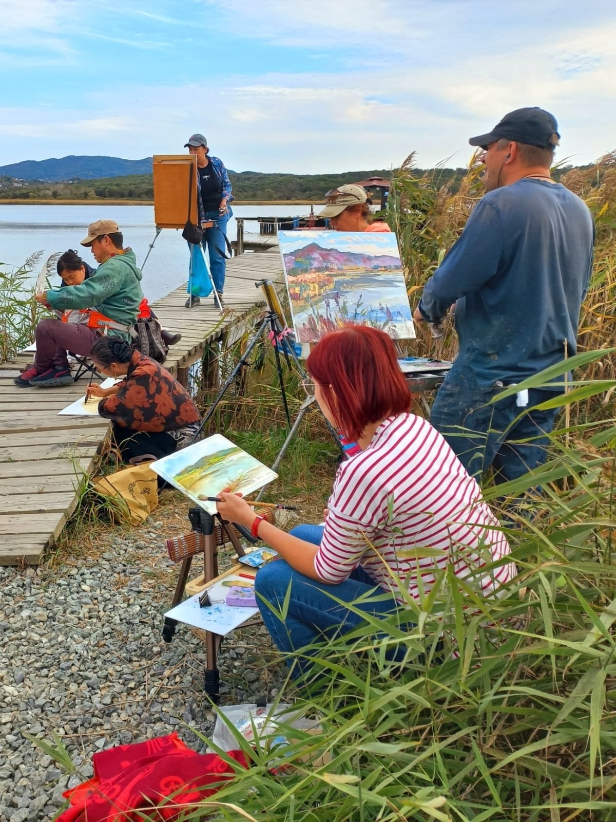 Ярким примером такого живого творческого обмена стали совместные выезды на пленэры, которые китайская делегация и находкинские художники организовали в минувшие выходные. Одна из таких встреч прошла на живописной территории базы отдыха "38 самураев", где в неформальной обстановке мастера двух стран могли пообщаться, поделиться секретами своего ремесла и создать новые работы, вдохновленные природой Приморского края. Культурный обмен случился благодаря Илье Кирницкому, председателю Хабаровского отделения "Творческого союза художников России", к нему обратилась с идеей одна из художниц.