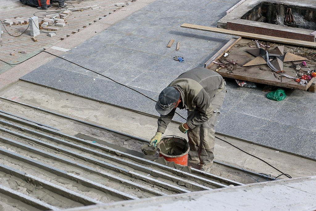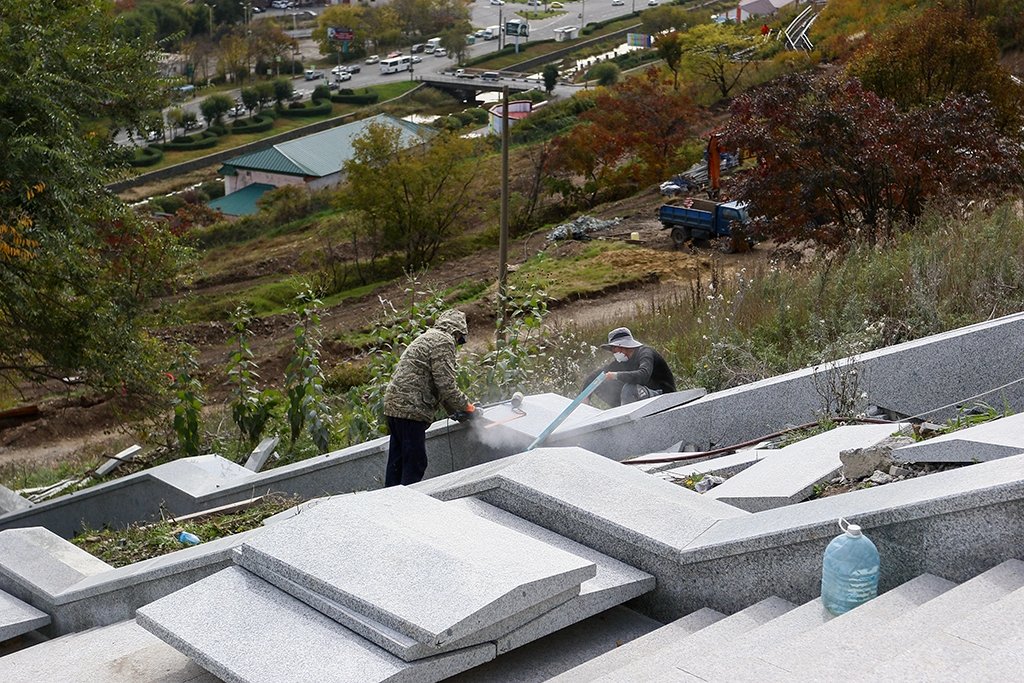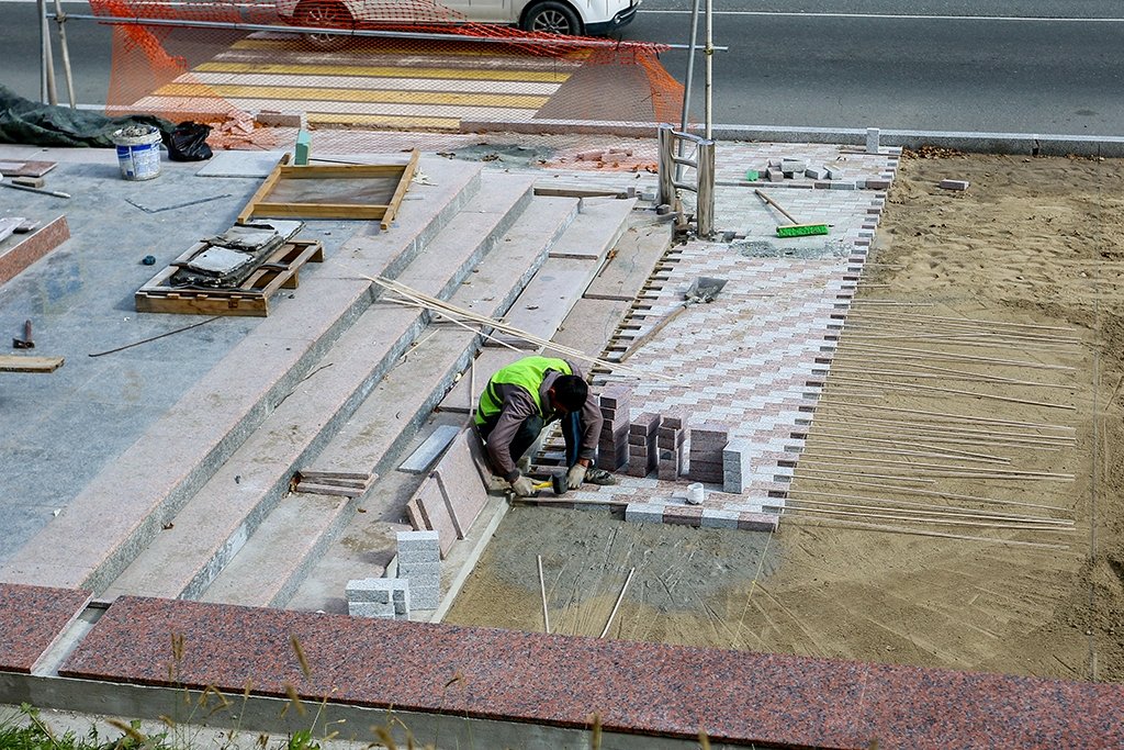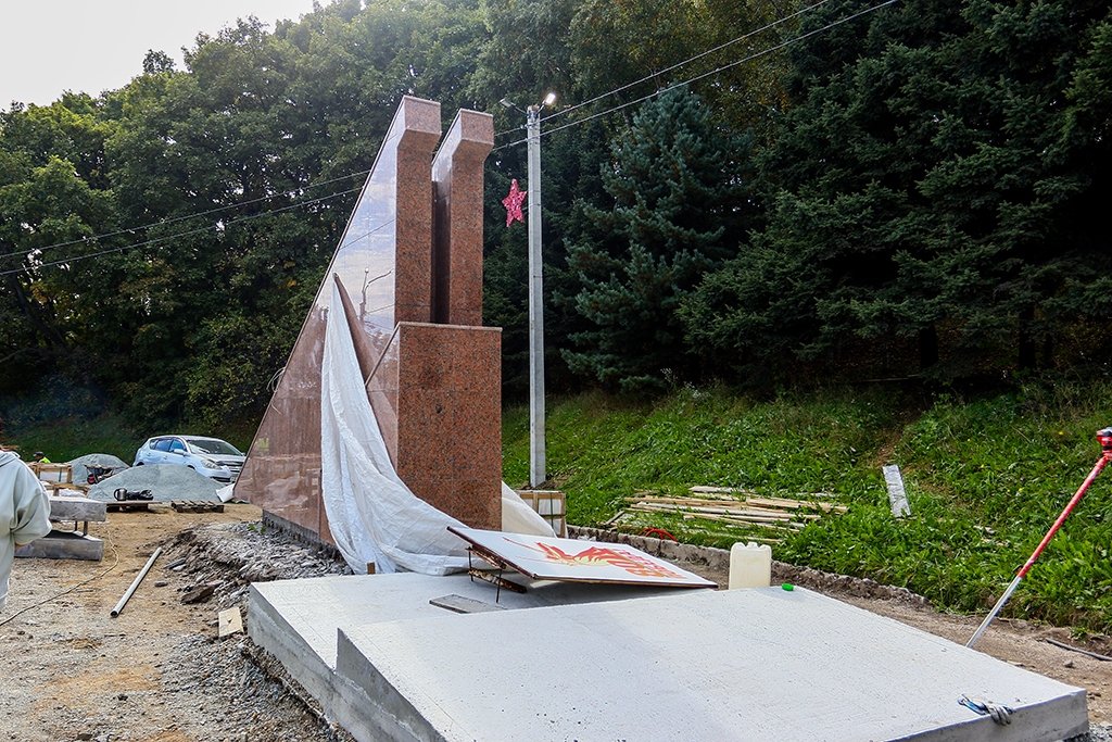 На Памятнике Победы ведутся активные работы по благоустройству. Идет работа по облицовке лестницы гранитом и подготовка к облицовке стелы. Полностью отреставрирован постамент для табличек, установка которых запланирована на завершающем этапе работ. Для защиты от подтопления и разрушения подпорной стенки смонтирован водоотводной лоток, а работы по укладке брусчатки подходят к завершению.