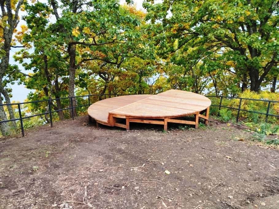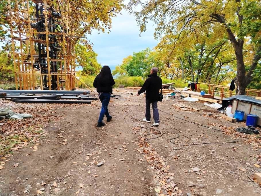 На участке ведутся активные работы по монтажу ключевых объектов и элементов инфраструктуры. На смотровой площадке "Башня Странника", металлический каркас которой уже готов, идет процесс обшивки деревянным брусом. На всем протяжении маршрута продолжается установка элементов освещения — уже завезено более 100 светильников, которые обеспечат мягкую подсветку пути снизу.