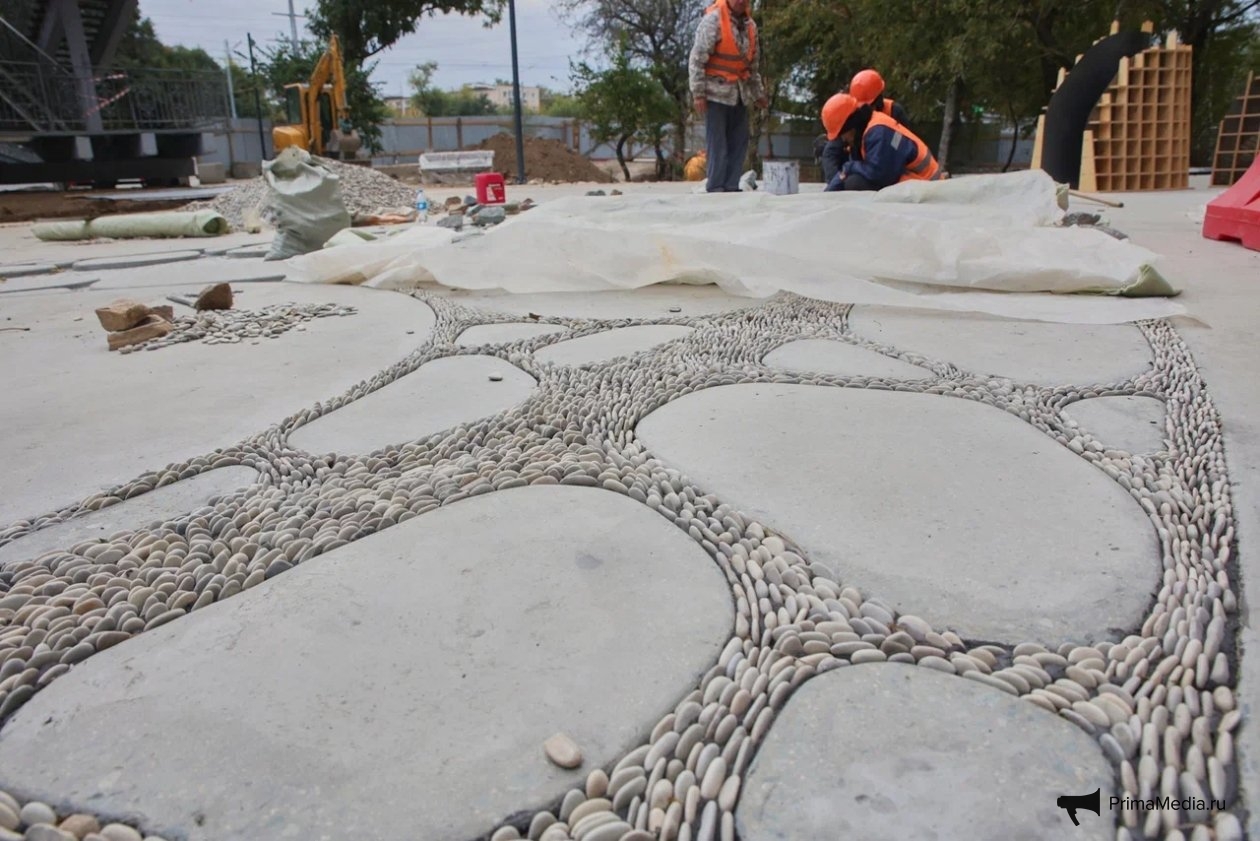 Пространство выкладывается мелкой речной галькой с последующей шлифовкой. В сочетании с пониженными зелёными зонами это создаёт эффект живого русла с цепочкой прудов и ручьёв, которое визуально перетекает в настоящую реку Вторая Речка.