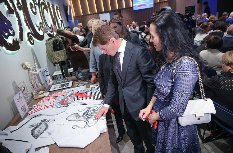 Во время форума губернатор также осмотрел выставку, приуроченную ко Дню матери (0+), в Национальном центре "Россия". Экспозиция "Край, где рождается солнце и море обнимает тайгу" представила товары, созданные руками жительниц региона: одежду, книги, украшения и косметику. Мероприятие организовано Центром креативных индустрий Приморского края.