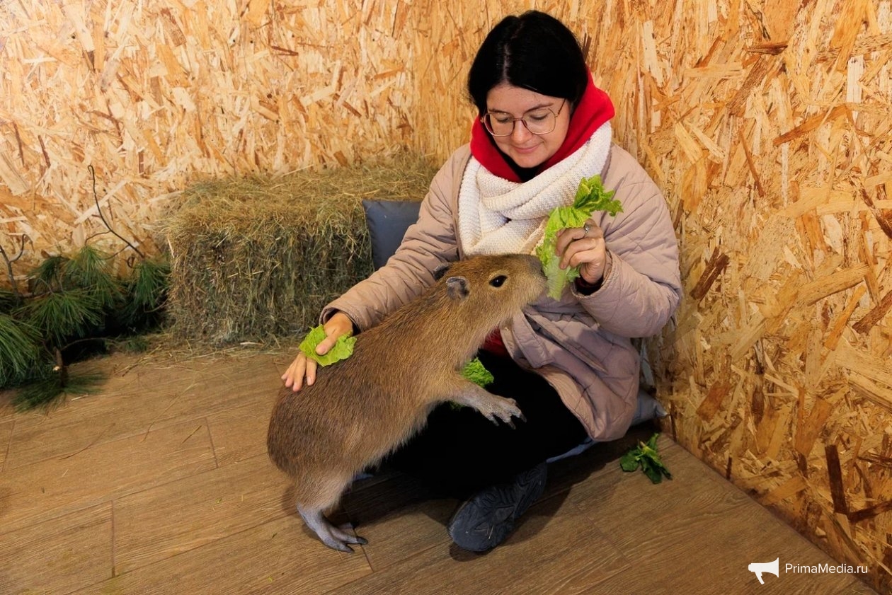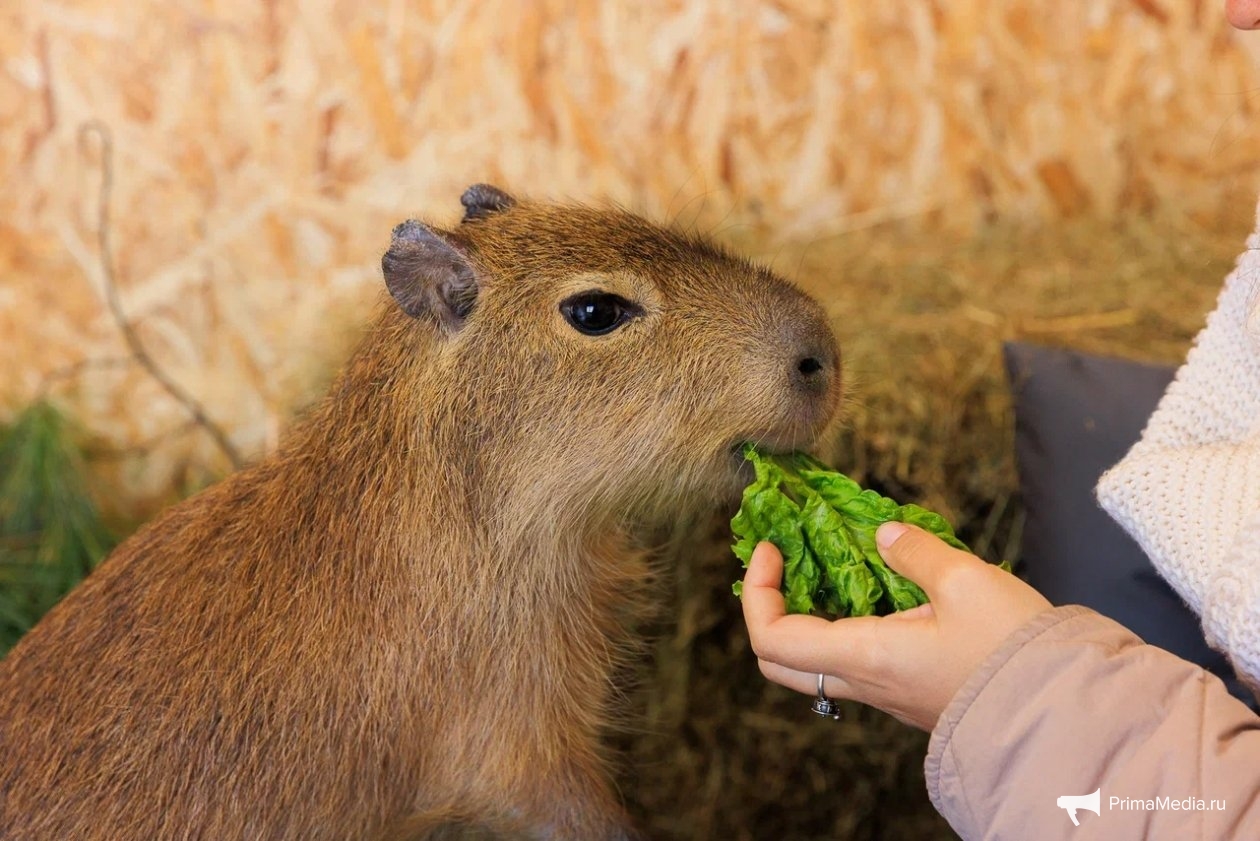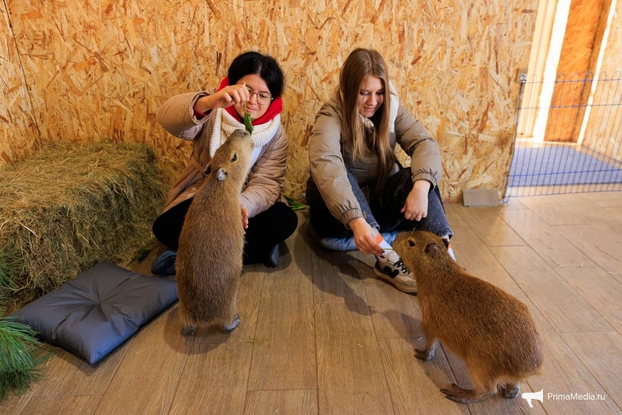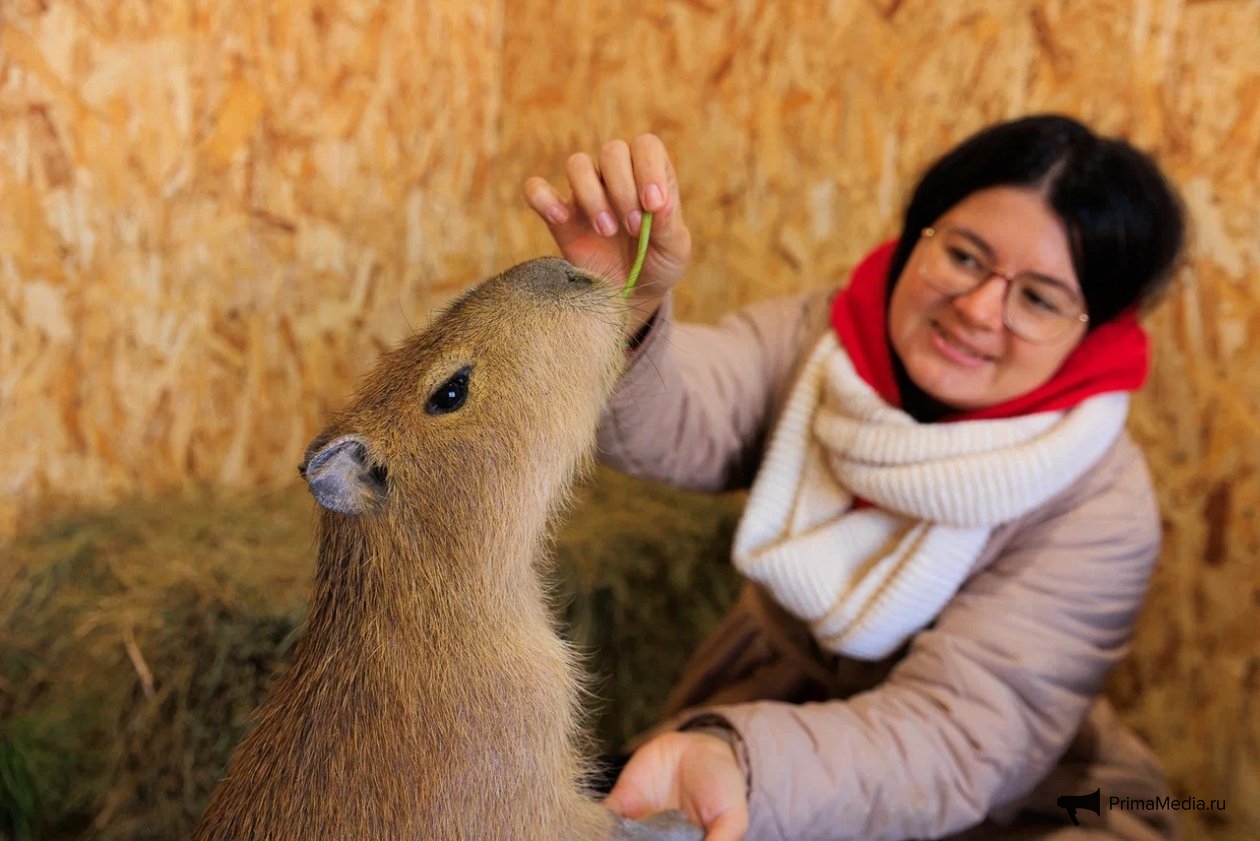 Пара капибар поселилась в 40 км от Владивостока этой осенью, став новыми обитателями фермы "Приморские альпаки". На прошлой неделе успешно завершился период адаптации животных и теперь с ними можно познакомиться лично, а не только наблюдать за их жизнью через окно. Корреспондент и фотограф ИА PrimaMedia посетили поселок Давыдовка Надеждинского района, где воочию увидели пушистых "антистрессов" и узнали, как им живётся на новом месте. Представитель фермы Мадина Новосад радушно рассказала об особенностях содержания этих необычных грызунов, их рационе и поведении.