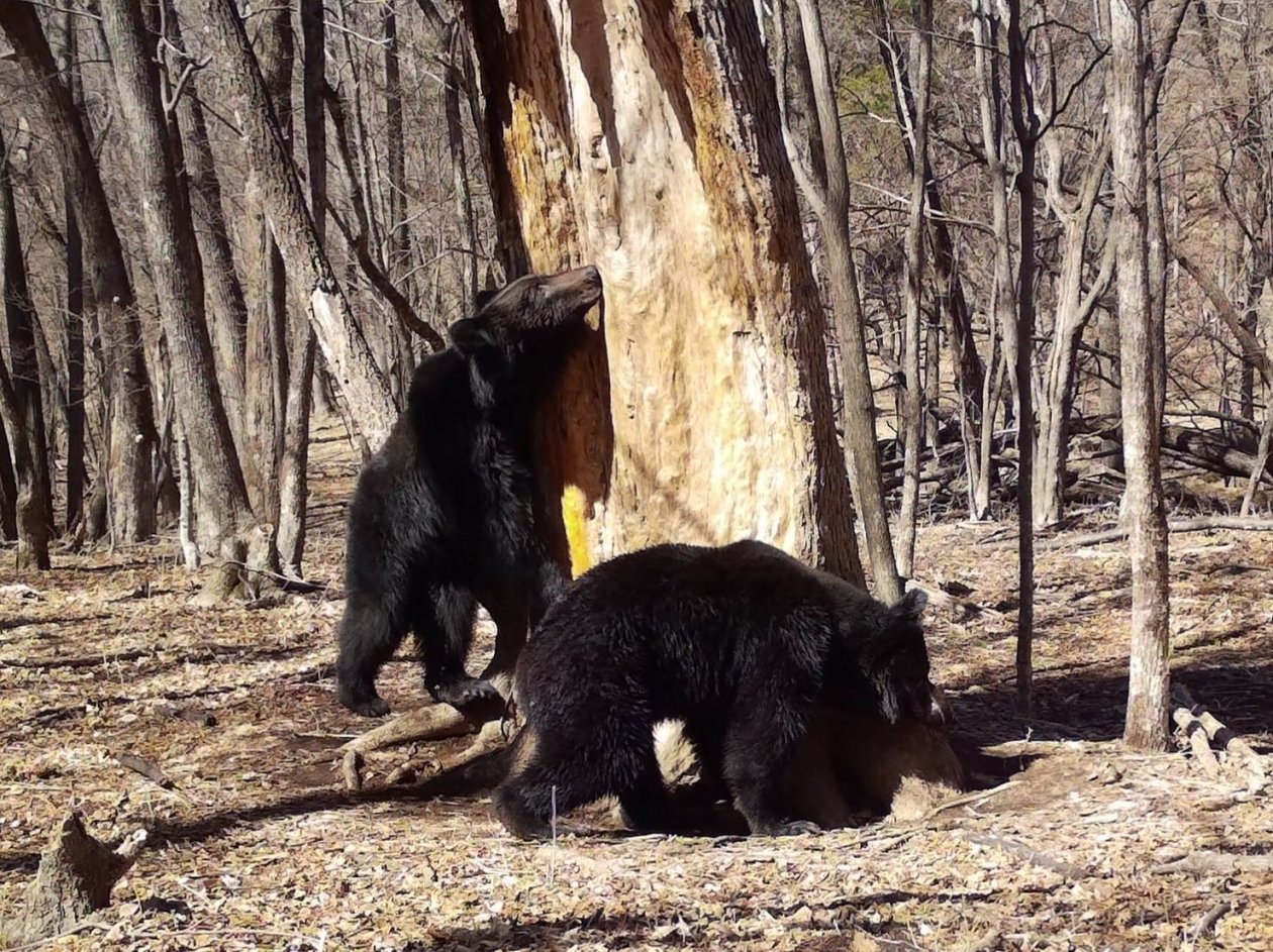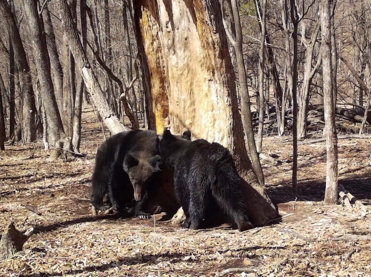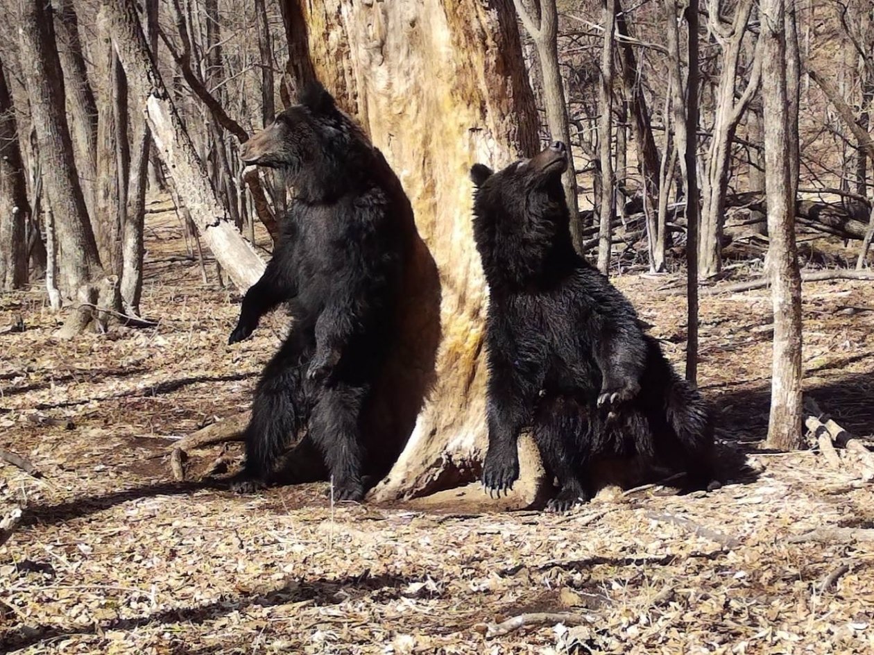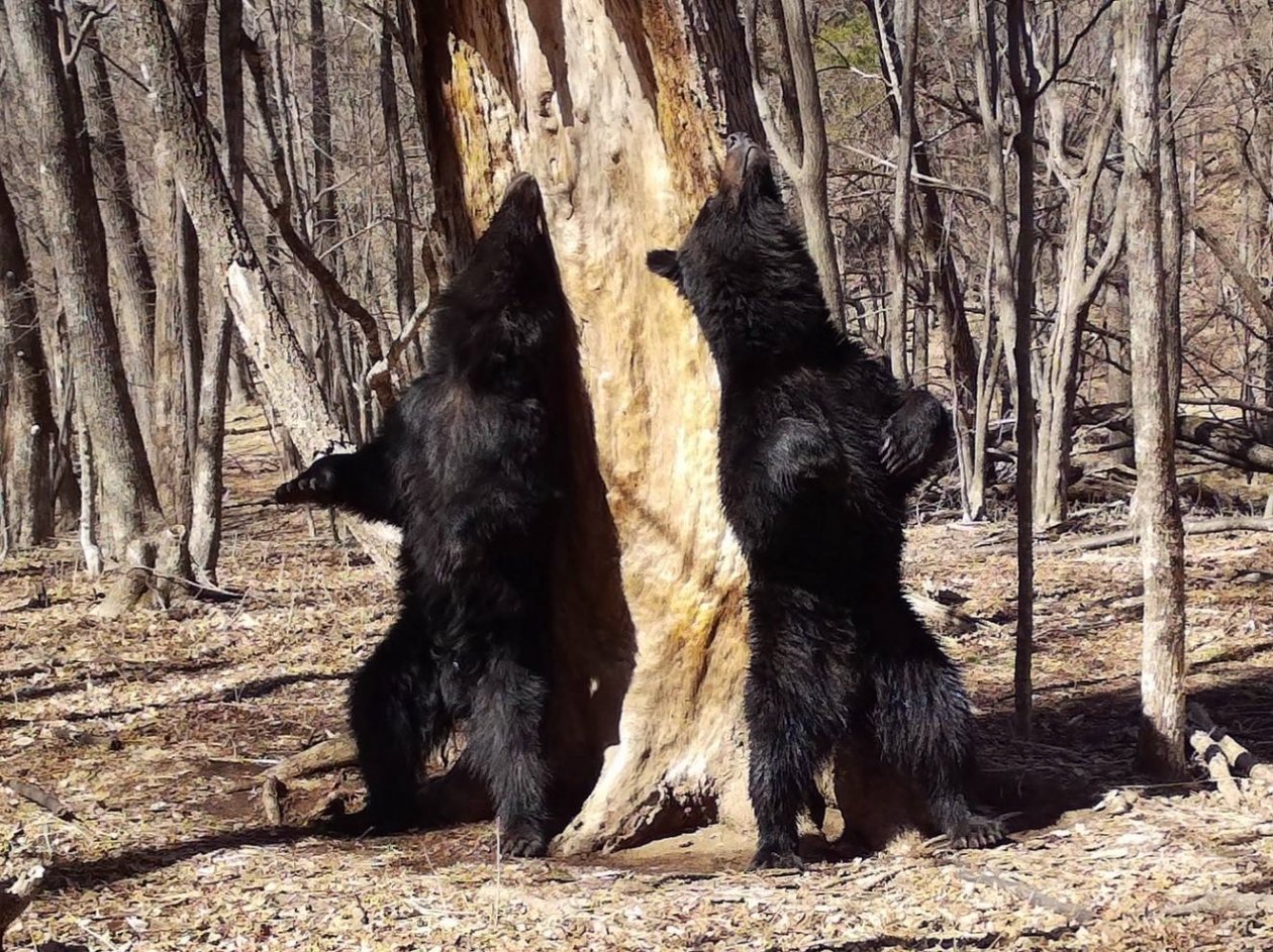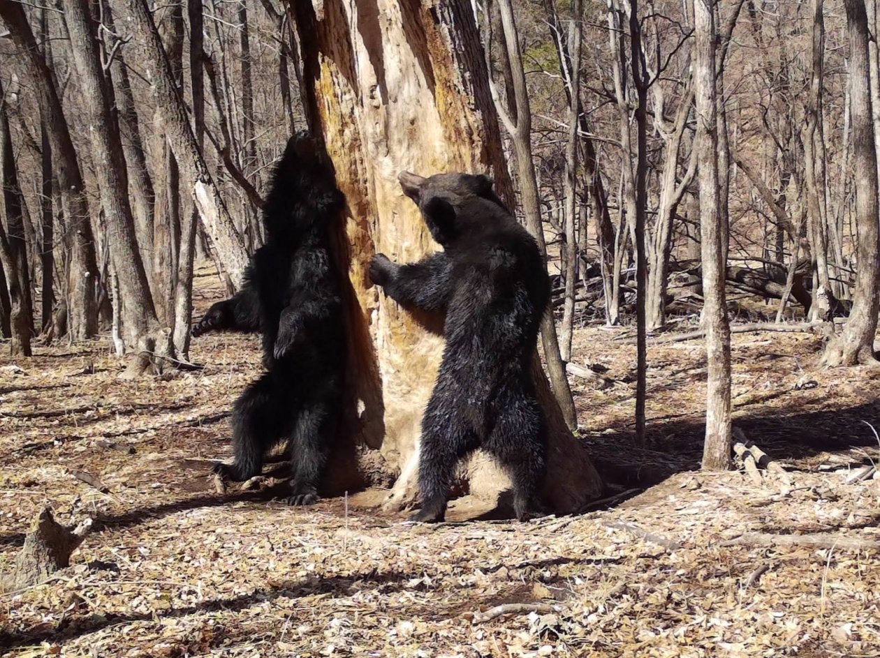В национальном парке "Земля леопарда" в Приморье фотоловушка запечатлела кадры "танца" двух молодых бурых медведей у двухсотлетней пихты цельнолистной. Самцы, которым около 3–4 лет и которые ещё недавно покинули мать, почти час исследовали ствол дерева, оставляя на нём свои метки — царапины, запахи и следы трения, сообщила пресс-служба заповедника.