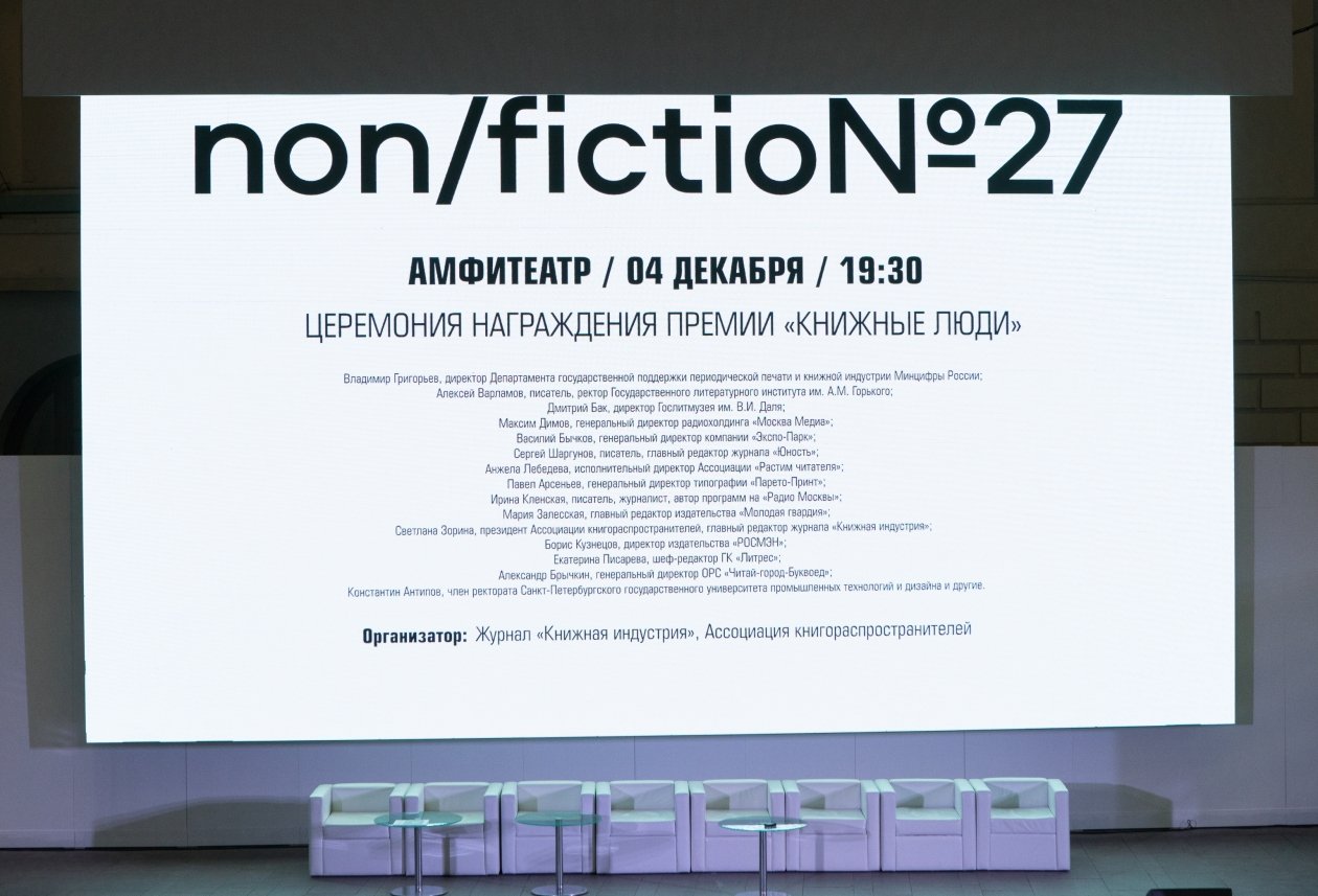 PrimaMedia, 5 декабря. Награждение лауреатов и финалистов первой премии "Книжные люди" (16+) состоялось 4 декабря в амфитеатре Гостиного двора, в рамках ярмарки интеллектуальной литературы non/fictio№27* (16+).