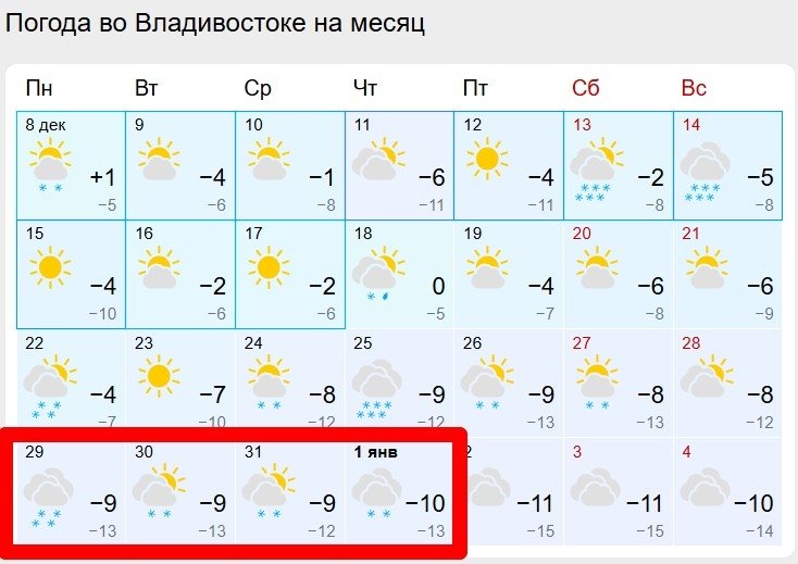 По долгосрочному прогнозу, в период с 25 по 31 декабря дневная температура во Владивостоке будет колебаться в пределах –8…–10 градусов, а ночью столбики термометров могут опускаться до –12…–15 градусов. В отдельные дни вероятны снегопады, что создаст типичные для конца года зимние условия — скользкие дороги и ухудшение видимости.