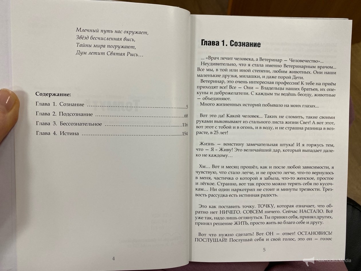 — Да. Книга состоит из четырех глав: "Сознание", "Подсознание", "Бессознательное" и "Истина". Постепенно, кусочек за кусочком, картинка полностью складывается. Текст метафорический, с примерами реальных научных экспериментов в мире психологии, с аналогиями между животными и людьми. Я сама ветеринарный врач, и это один из моментов, который натолкнул меня на написание. Работа ветеринарного врача — это тяжелая работа. Постоянный внутренний конфликт: между человечностью, желанием помочь всем, и материальным миром, где, если так делать, сам разоришься. Этот вечный поиск баланса и стал одной из основ книги.