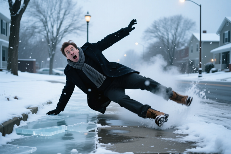Снег с дождём, прошедший во вторник, 23 декабря, оставил после себя не только слякоть, но и коварную ледяную корку на тротуарах. Для многих горожан утро среды превратилось в настоящее испытание: скользкие ступени, замёрзшая каша у подъездов и обледеневшие пешеходные зоны.