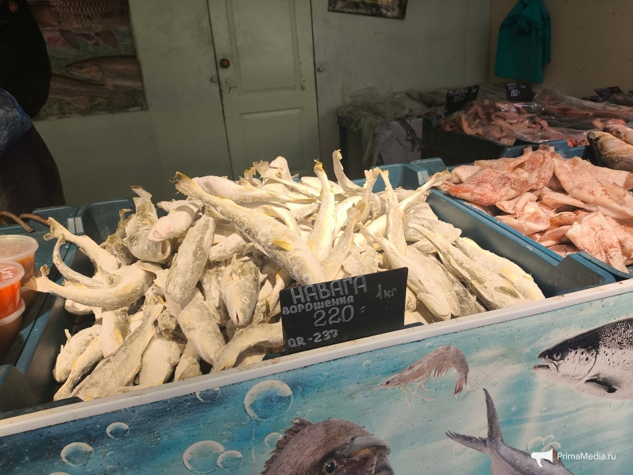 Самым рыбным местом пока можно назвать рынок на Спортивной. Здесь несколько точек, где торгуют рыбой прямо на улице, хотя и холодильники тоже есть. Однако в отличие от прошлых лет наваги немного. В продаже есть как улов этого сезона, так и прошлогодний. Например, в одной из точек предлагают камчатскую навагу без головы по 160 рублей за килограмм. Выглядит она не очень презентабельно, но в продаже ее немного — значит спрос есть. Кстати, указана дата вылова — 28 ноября 2025 года.