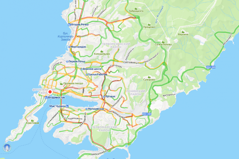 Основные заторы сохранятся на Чуркине, Баляева и Зеленом углу. Площадь Луговая стоит как наверх, так и вниз. Замедленное движение наблюдается по Калинина в сторону центра города. Множество автомобилей скопилось перед главными крутыми подъемами города. Гололед на дороге не способствует быстрому движению.