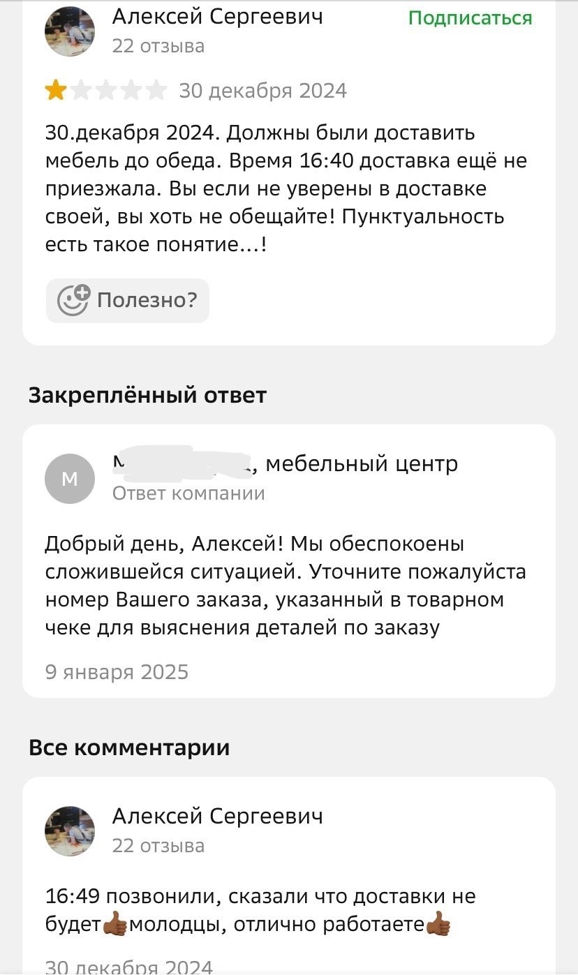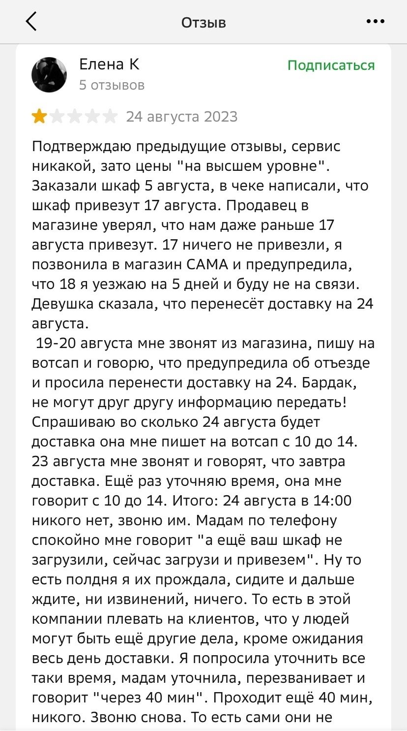 Подобные сообщения от клиентов можно найти и на многих платформах. А одна из покупательниц детально описала, как заказывала шкаф в августе. История, как под копирку повторяет случай с юбилейным креслом: назначенная дата доставки была проигнорирована, сотрудники не координировали действия между собой, а в день Х клиента заставили прождать несколько часов без единого звонка или извинения.