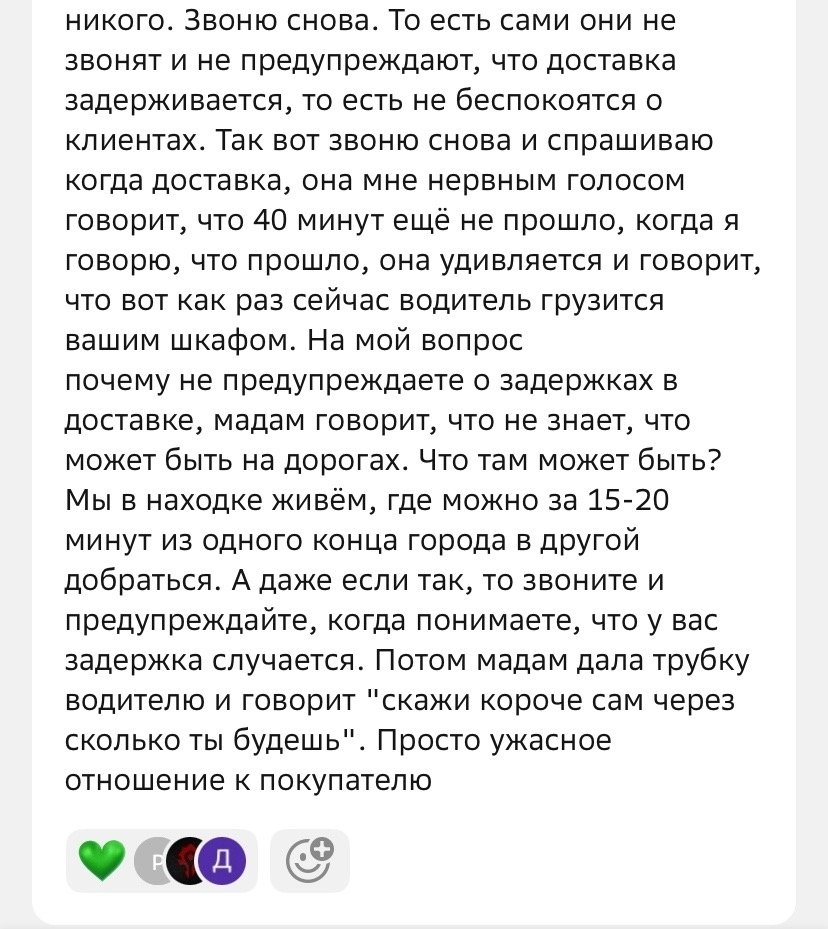 Подобные сообщения от клиентов можно найти и на многих платформах. А одна из покупательниц детально описала, как заказывала шкаф в августе. История, как под копирку повторяет случай с юбилейным креслом: назначенная дата доставки была проигнорирована, сотрудники не координировали действия между собой, а в день Х клиента заставили прождать несколько часов без единого звонка или извинения.