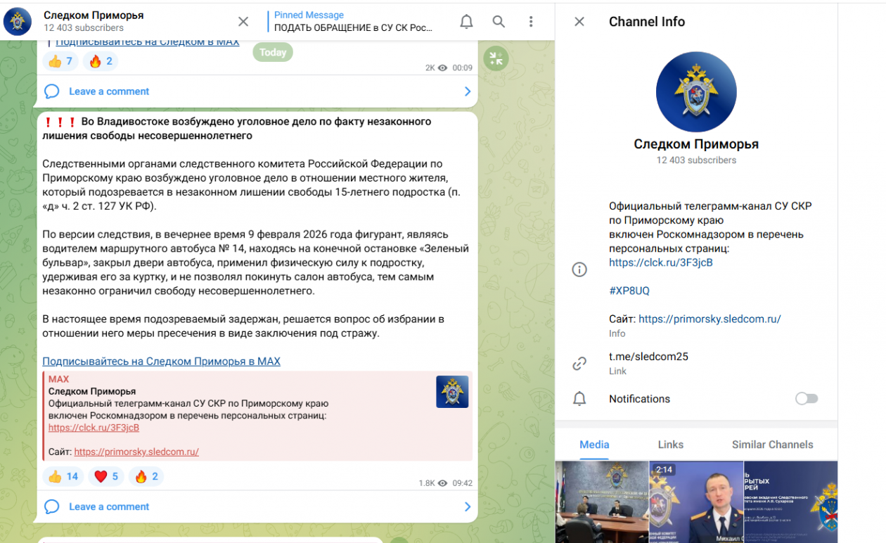 На сегодняшний день Telegram-каналы ведомств Приморского края демонстрируют значительную вовлечённость аудитории. Лидером среди них (не считая правительства и администрации) является канал прокуратуры — за ним следят более 19,4 тыс. человек, хотя на платформу Max перешла лишь мизерная часть аудитории (всего 340 человек). На втором месте — канал Следственного комитета с 12,4 тыс. подписчиков. Каналы регионального Минздрава, ГУ МЧС России по Приморскому краю и Примгидромета насчитывают соответственно более 9,2 тыс., 7 тыс. и 5,5 тыс. подписчиков.