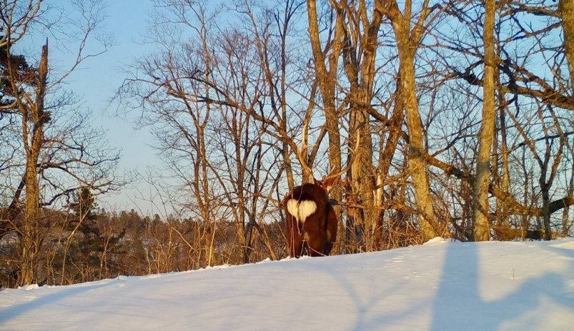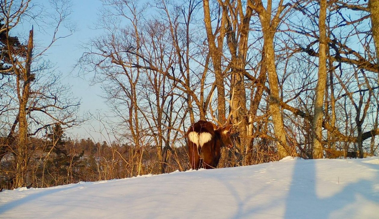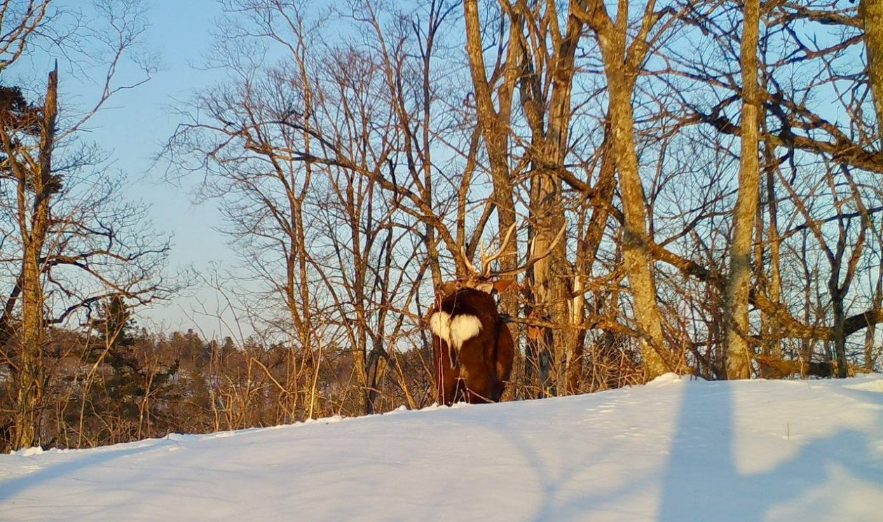 "Главное орудие оленя для сражения — рога. Во время гона самцы устраивают "турниры", в ходе которых выясняют, кому достанется дамское сердце. Но, видимо, что-то пошло не так, ведь битва с деревом оказалась более увлекательной для копытного", — говорится в сообщении.