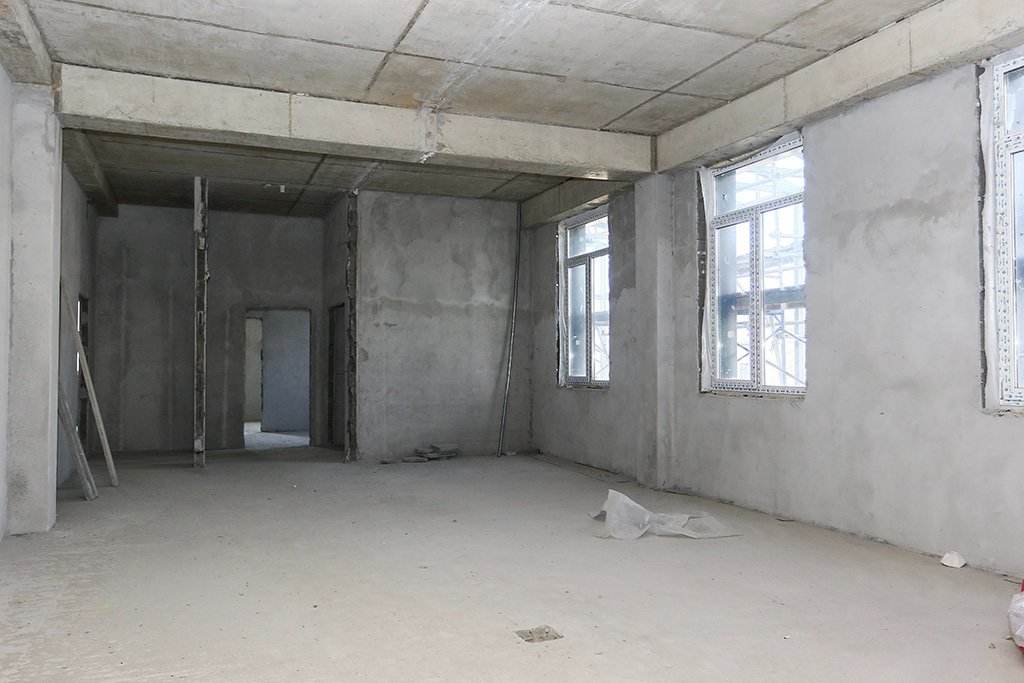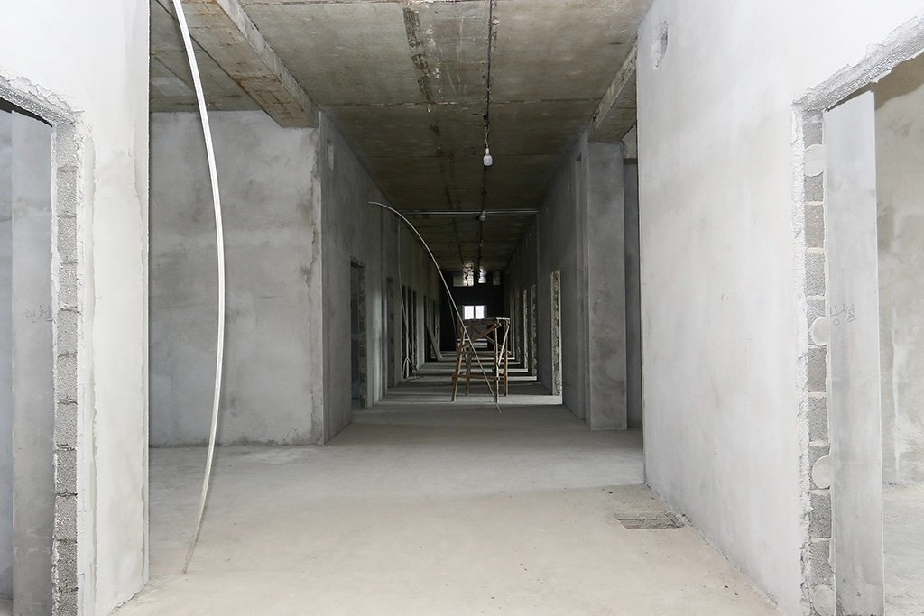 По оценке представителя подрядчика, штукатурные работы внутри здания выполнены на 90%. Фасад отделывают параллельно, а инженерные сети уже полностью смонтированы. На кровле оставлен технологический проем — через него позже завезут вентиляционные установки и крупногабаритные конструкции. Гараж поликлиники готов на 80%.