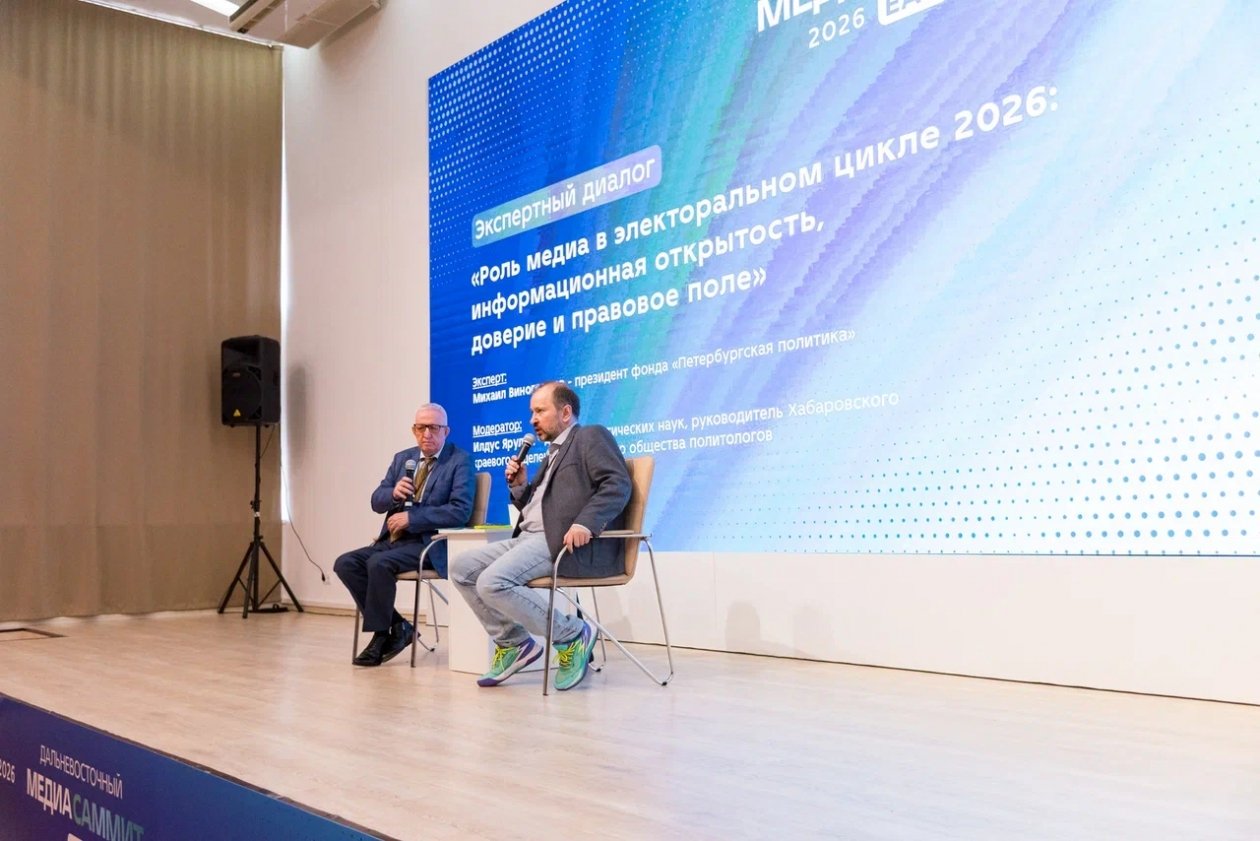 EAOMedia, 10 апреля. Экспертный диалог "Роль медиа в электоральном цикле 2026: информационная открытость, доверие и правовое поле" состоялся в рамках Дальневосточного МедиаСаммита (12+), который проходит в Биробиджане с 9 по 12 апреля. Спикером мероприятия стал президент фонда "Петербургская политика", регионовед Михаил Виноградов. Модератором встречи выступил доктор политических наук, руководитель Хабаровского краевого отделения Российского общества политологов Илдус Ярулин.