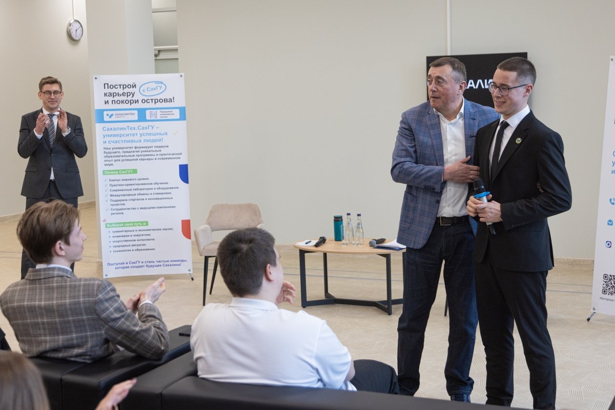 Кроме того, на встрече обсуждались образовательные перспективы. Студентка третьего курса Мария Петрова поинтересовалась развитием СахГУ. Валерий Лимаренко отметил, что университет стал опорным вузом "Газпрома", что открывает студентам доступ к практике и трудоустройству на шельфовых проектах. Совместно с МФТИ и Бауманским университетом ведутся разработки в сфере водородной энергетики.