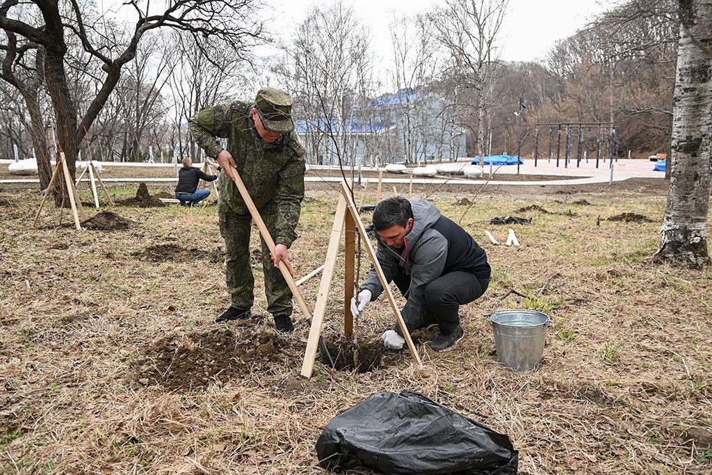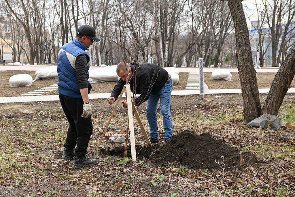 Nakhodka.Media, 21 апреля. В сквере у Центра культуры в Находке высадили более 50 берез. Работы ведутся в рамках федеральной программы "Формирование комфортной городской среды". В посадке участвовали глава города Тимур Магинский, участники специальной военной операции, молодые добровольцы, общественные наблюдатели и жители.