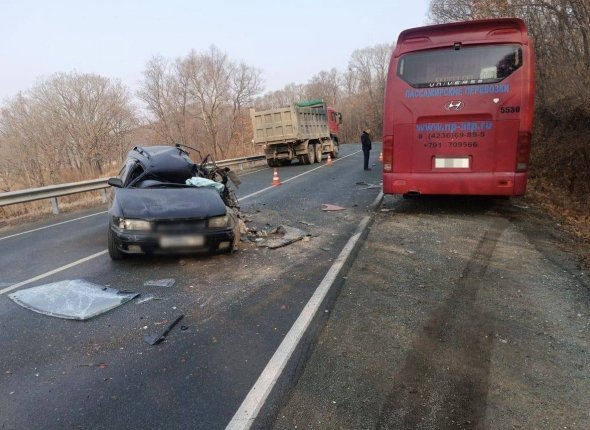 Пассажирский автобус "Находка - Владивосток" попал в смертельное лобовое ДТП. Фото: УМВД РФ по Приморскому краю
