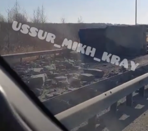 Nakhodka.Media, 12 декабря. Серьёзное ДТП на трассе в районе Де-Фриза заблокировало движение. В результате массовой аварии перевернулся гружёный камнями большегруз.