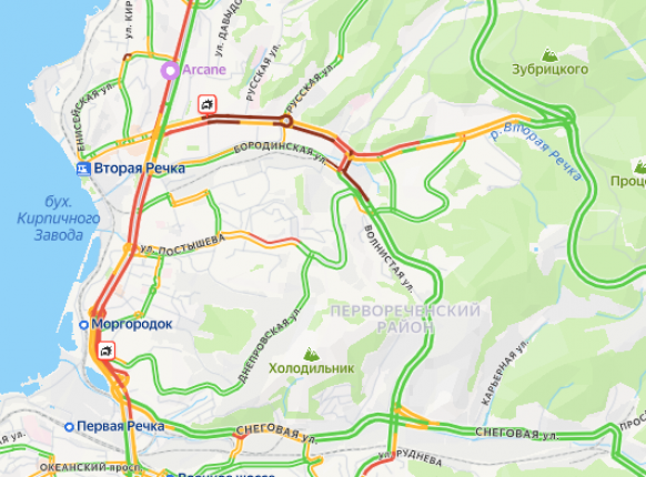 Утром, 19 декабря, дорожная обстановка в столице ДФО резко осложнилась из-за внезапных осадков. Сильные заторы образовались на развязке в районе Русской по всем направлениям, сообщает Яндекс.Карты (18+). Кроме того, на Низководном мосту в направлении объездной дороги и на Седанке наблюдается сильная скованность движения.
