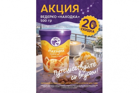 Фабрика мороженого "УРСА" запускает весеннюю акцию на ведёрко мороженого "Находка" 500 грамм. С 1 по 27 апреля 2026 года покупатели смогут приобрести продукт со скидкой 20% во всех городах присутствия, сообщает пресс-служба Фабрики мороженого "УРСА".