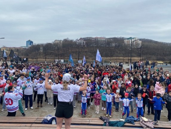 Эстафету приняла тренер спортивного клуба "Руслан" и руководитель клуба зимнего плавания "Моржи Находки" Ольга Степыкина. Она провела для собравшихся энергичную физическую разминку. Все команды дружно разогрели мышцы, взбодрились и зарядились хорошим настроением.