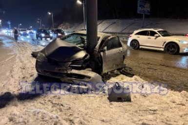 "Тачка в мясо": автомобиль "намотался" на столб ночью в столице ДФО — есть пострадавшие